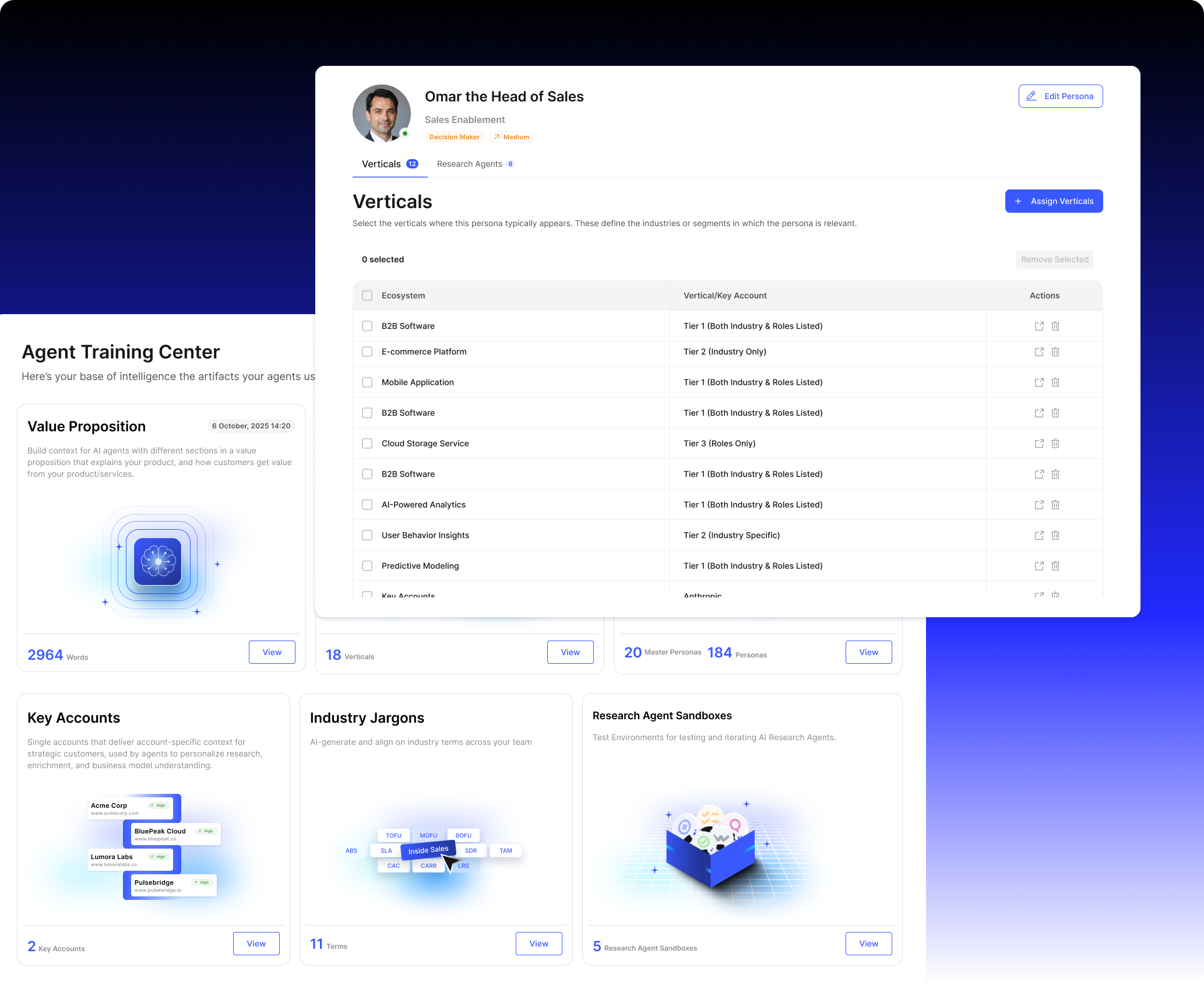 Instead of jumping between enrichment platforms, persona docs, sales playbooks, and CRM notes, our Agent Training Centre gives you one place to manage and activate GTM knowledge, feeding it directly into every workflow.